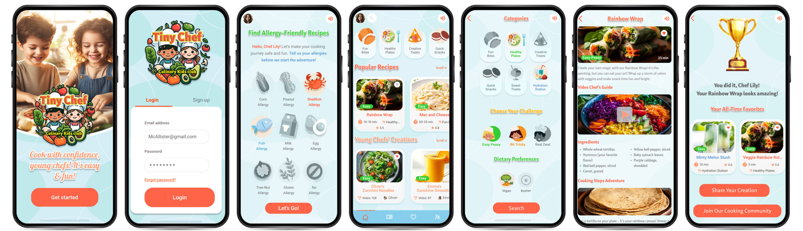 To kick off the Tiny Chef project, I conducted comprehensive research to understand the current market for children’s cooking apps. Although there were several existing options, none fully met the needs for a genuinely interactive, accessible, and educational platform designed specifically for young chefs. Unlike other apps, Tiny Chef fills this gap by combining engaging learning experiences with practical cooking skills in a safe, voice-assisted, and allergy-aware environment. This unique concept centers around making cooking accessible to all children, especially non-readers, with features like bold visual categories, voice-guided recipes, and challenge levels that adapt to their abilities.