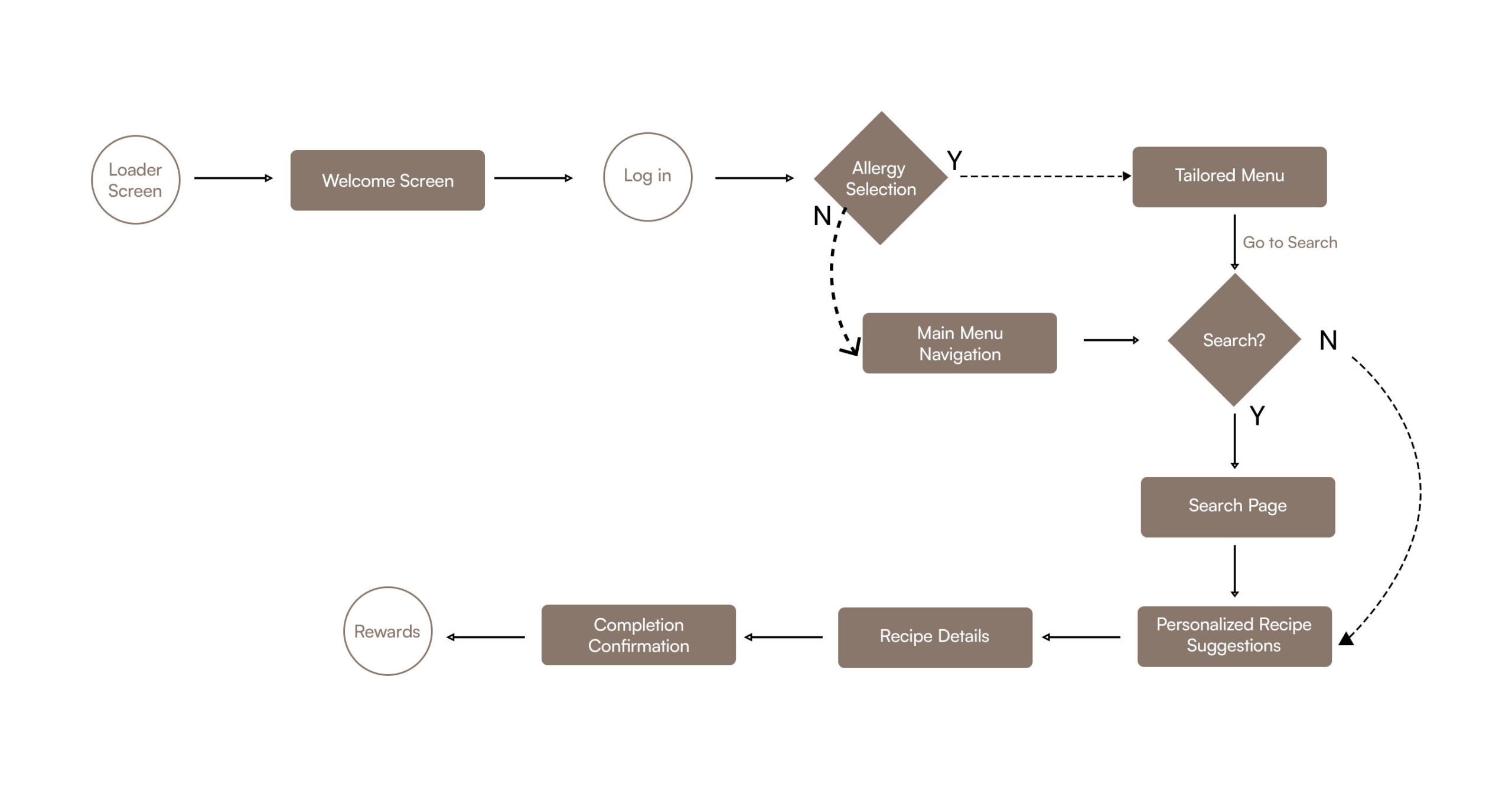 Using these findings, I created Storyboards to illustrate key user scenarios, such as young chefs navigating a visually driven cooking experience. From there, I developed a User Flow to guide kids through categories like “Fun Bites,” “Healthy Plates,” and “Sweet Treats,” allowing them to choose recipes by difficulty levels and complete cooking challenges with rewards.